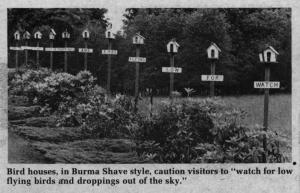 It's Birdland U.S.A., featuring single family dwellings, duplexes, apartments, condominiums and swanky mansions for his feathered friends - all available rent-free for a song. There's a Bird Cage Saloon, The First Bird Church, and Song Bird School, all of them moulted on long poles, well out of reach of cats or other would-be intruders.