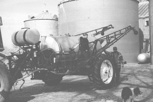 McNeil made a 70-gal. clean water tank out of a liquid starter tank off an old planter and mounted it on front of the sprayer. He also mounted hinged steps on back that flip down for filling and up out of the way when not in use.
