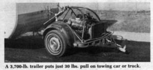 "Few cars built today can handle the weight of a big trailer over 15 ft. long," says Thomas Moravec, president of Tow-All, Inc., manufacturer of a new motorized hitch that lets any small car pull any size travel trailer or wagon with ease. Only about 30 lbs. pressure is applied to the towing vehicle.
