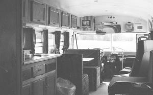 "We first removed the seats and painted the ceiling. Then we installed 110 and 12-volt wiring and panelling below the windows. Next we framed up and paneled a back room, bathroom, and closet. We also installed kitchen cabinets with sink and ice chest, dining area, bunks, and two seats.
