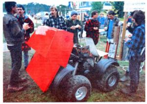Built from the ground up, the rig is powered by a 4-cyl. car engine yet it's no bigger than a standard 4-wheeler. It's fitted with four flotation ATV wheels, each of which is chain-driven by a driveshaft that runs across the center of the machine, positioned exactly between the wheels. Treloar simply used an auto rear end, with brake drums mounted on either end of the drive-shaft. Drive sprockets on either end of the driveshaft mount next to the drums. There's a chain on each side, running from the drive sprocket on the driveshaft to both of the wheels on each side. To steer, Treloar simply brakes either side, alternately stop-ping each drive chain so the rig skid-steers.