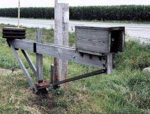 It consists of two 2 by 8's mounted horizontally on a 4 by 4 post. The mailbox mounts at one end and there's a cement-filled wheel weight on the other end to keep it balanced. The mailbox itself is protected on all sides by 2-in. boards and there are braces down the base of the post for strength. (C.F. Marley, P.O. Box 93, Nokomis, Ill. 62075)