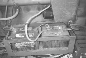 He started with two 27-in. lengths of 2-in. angle iron and made a "U" out of them to form the ends. He cut two lengths of 21-in. angle iron and welded them between the two U-shaped angle irons to form the tray. He then welded lengths of 2-in. strap iron around the top edge of the box to hold the batteries in place. A piece of sheet metal was cut and laid in the bottom for the floor. A length of strap iron laid crosswise in the middle underneath the box helps reinforce the floor. He cut a couple of holes into a piece of 3-in. wide, 30-in. long, 3/8-in. thick strap iron and welded it to the box, then bolted the entire unit to the tractor frame. Old pieces of baler belting were laid in the bottom of the box to cushion the batteries.