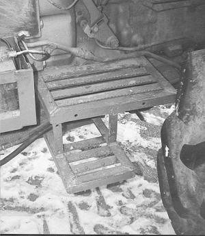 Krueger used 1 1/2-in. angle iron to make frames for the steps and welded lengths of feeder chain slats from a Deere 55 combine underneath, facing the teeth up to provide good traction. The slats are spaced about 1 in. apart. Lengths of angle iron connect both steps. The back sides of the steps are welded to a 7-in. wide, 19-in. long piece of steel cut out of a truck frame. It bolts to the tractor frame using the same bolt holes as the original steps.