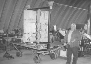 The cart measures 4 by 5 ft. and carries a 7-ft. high, 4-ft. wide steel frame that holds the "Lazy Susan" - four panels of plywood with all eight sides fitted with tools. The plywood panels attach to a metal shaft that runs vertically down the middle of the frame. The bottom end of the rod rotates on a bearing installed in the floor.