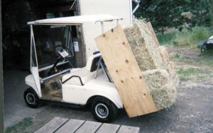 He bought two used carts for $900 and $700. Taylor spent just three hours modifying the first cart, adding a wood dump box on back for hauling lawn clippings, bales, etc. He put a flatbed on the second cart, made from angle iron and plywood. The bed sits at a 75 degree angle and accommodates up to three hay bales standing on end.