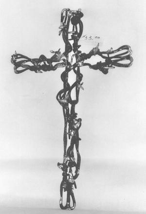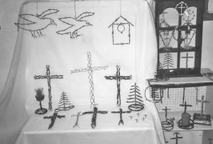 His favorite objects are crosses and figures. The pieces often contain up to 30 ft. of twisted or braided barbed wire. "I wear leather fencing gloves," he says. "I've worn out several pairs of gloves along with wire cutters." The finished pieces are left free-standing, mounted on walls, or even set on animal bones for display.