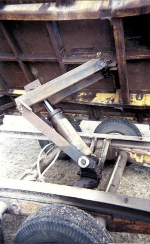 The dumping mechanism is powered by a 40-ton, hydraulic hoist that I got from a salvage yard.I didn't have any specifications or plans for the 3-way dump hinge, so I experimented until I came up with the right dimensions that would provide the desired lift. Once I had a model made, I constructed the real unit with heavy steel components.