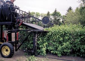 The hydraulic-operated, 2-WD machine straddles a hedge and is equipped with three sicklebar sections that let him trim the sides and top all in one pass. A 42-in. wide length of draper canvas off a Versatile swather delivers top trimmings to the side and onto the ground. The rig's four legs are each equipped with a hydraulic cylinder, allowing the entire machine to be raised or lowered up to 9 in. Another pair of cylinders can be used to independently raise or lower the sicklebars 9 in. If he's working on hillsides, he can hydraulically raise just one side of the machine, or just one side of the sicklebar unit.