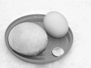 According to Interfax news service, at more than 1/3 lb. it's almost three times the size of an average chicken egg and outweighs the current Guinness Book of World Records holder by 14 grams. That record has been held for the past five years by a Cuban hen.