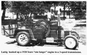 One lunger makes good parade tractor AG WORLD Ag World 13-6-19 The first couple years after Dale Luttig, Emmett, Kan., bought a 1928 Sears Economy "one lunger" engine, he hauled it around to shows on a trailer. Then one day, while pulling the engine in a parade, he started to think, "Why not let this engine pull itself?"