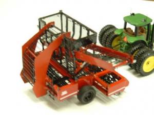 The toys include two different styles of beet lifters. One resembles a Wick 8-row beet harvester, while the other resembles an Amity 12-row beet harvester. Both models have diggers in front that lift beets up out of the ground and put them on a series of conveyors, which dump the beets into a truck. He also made a 12-row defoliator that tops the leaves off the plant. It has knife-like scalpers on the back side that cut off an inch or so off the top of the beet where the leaf grows out. There are three sets of flails under the topper.