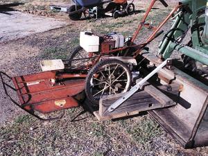 Front-End Mower Chops Down Bushes FARM HOME Lawn Mowers (31h,38) 30-3-27 David Heisley, Creswell, Ore., needed a way to cut down an overgrown blackberry hedge that had reached over 10 ft. tall. He came up with the idea of attaching his old DR brush mower to the front-end loader of his Deere 770 and lifting it up to cut.