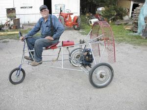 He had hung onto the 30-in. propeller he bought back then for $3 out of Popular Science magazine. Last year he mounted the propeller, a steel dump rake seat, and two motorcycle wheels on a frame, with a single bicycle wheel on front.