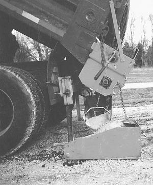 The box hangs from a framework that is bolted to the frame of a dump truck equipped with an auger at the tailgate. When the box is in place, material is augured to drop into the "gravel" box. As it falls onto the road shoulder, the backside of the box strikes it off at the desired level. "The sides keep it restricted to the 18-in. width," says Pierce. "Dumping to the left allows the operator better visibility of the box and better control over release of materials."