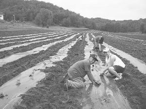About 13,000 pumpkin plants were started in black plastic mulch to prevent weeds. Three strands of electric wire surrounded the patch to keep deer out since they'll break the pumpkins open with their hooves to get at the seeds.