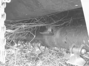 The PFRA-tested unit produces bales weighing between 770 and 880 lbs. It's a modified New Holland BR 740 round baler. Instead of a standard windrow pickup in front, it's fitted with heavy flail knives that turn on a 2,200-rpm rotor. The shredder breaks down the trunks/stems so they're flexible before they enter the bale chamber for wrapping.