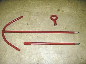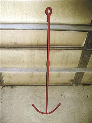 The tool consists of 5/8-in. cold-rolled rod, bent to an "anchor" shape. One long end of the rod has coarse threads sharpened to a point, so it easily pushes into the blockage of hay in the pickup.