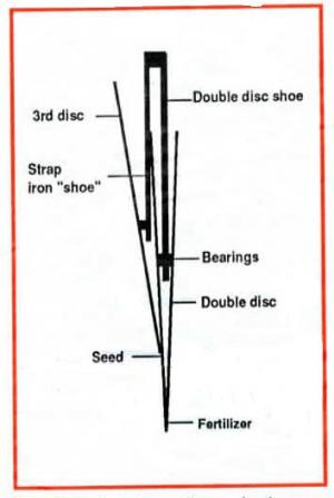 I've come up with a new triple disc drill shoe design that makes it easy to deep-band fertilizer below seed. I made it by adding a third disc to a standard double disc opener. The disc is positioned to the side and higher than the original two discs. In the new configuration, the original double discs place the fertilizer in a deep band and the third disc places the seed. I made one unit last year and mounted it on a Haybuster 1206 drill. I simply used a Haybuster disc for the third disc. The disc bolts to a strap iron shoe mounted off to the side of the double discs. The triple disc shoe worked just the way I thought it would with no problems. I'd like to develop the idea commercially. (Lloyd Twite, Rt. 5, Minot, N. Dak. 58701)