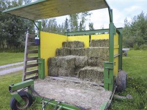 “In the evenings and mornings I haul the pallets of bales to my shed with two wagons, one behind the other, two pallets per wagon. In the shed I double stack the bales, staggering the top row so the top pallet straddles two lower pallets. My Deere 4020 front-end loader with forks can comfortably handle the 2,000-lb. plus loaded pallets. Another big advantage of the pallets is that the bales are held off the ground allowing air to flow underneath.”