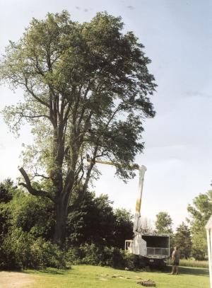 The photo shows the company installing a lightning rod about 60 ft. up into an 85-ft. tall elm tree.