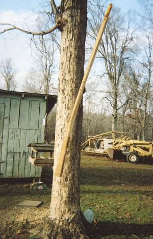 He shaved a 10-ft. long hickory stick so that it’s slightly wider at the bottom. He found the balance point for the stick and drilled a small hole 1 in. above that point, then drove a 20-penny nail through the hole and into the tree. Because the hole is off center the stick normally sets in an upright position. To hold the ear of corn he drove a 1/4-in. dia. metal rod into the end of the stick and drilled a hole lengthwise through the ear.