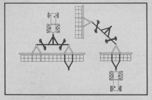 To switch to the transport position, DeHaan unhooks from the hitch, unhinges the planters and hooks up to a transport tongue attached to the back of one planter (see drawing). As he pulls ahead with the tractor, the second planter automatically falls into position behind the first planter. He then locks the tires on the hitch in the straight position. The transport tongue pivots off the front of the planter so it can swing up and out of the way when planting.