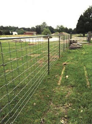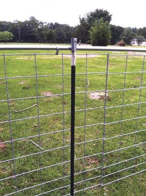 Once the top rail was in place, he used chain link fence hangers to hang the 52-in. high mesh cattle panels, wiring them together end-to-end and to the T-posts.