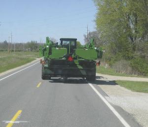A Deere cab mounts on a manual turntable, allowing Maust to drive forward in the field and on the road. After turning the cab 180°, the three mower heads are tucked into a 15-ft. width behind the cab for transport.