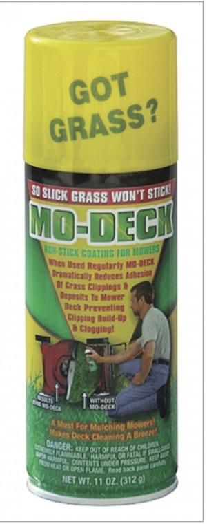 Mo-Deck Aerosol Undercoat For Mower Decks FARM HOME Lawn Mowers 31h 38 MDI Products 36 Hovey Rd Monson Mass 01057 ph 866 213-0772; www mo-deck com : Grass has a tougher time building up under mower decks treated with Mo-Deck aerosol undercoat says the company It keeps wet grass from sticking to the deck and greatly reduces the need to do any power washing or scraping to get the deck and blades clean The product creates a slick non-stick surface ideal for build-up areas including the mower’s blower housing and chute An 11-oz aerosol can sells for $7 95 plus S&H