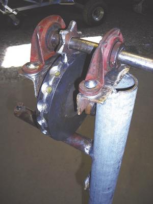 Hoard built a bracket from angle iron for the tap and die and attached it to a 42-in. length of 2-in. pipe. The pipe is sized to fit over and rotate on any T-post driven into the ground. The tap is welded on a shaft that is mounted between 2 pillow-block bearings on the bracket. The die freewheels on a second shaft between 2 bearings mounted to the bottom of the bracket.