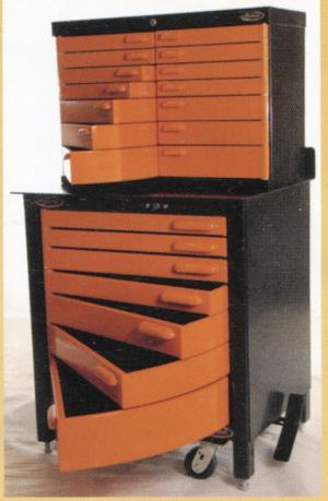 The all-steel tool cabinets come in a variety of sizes and styles. All share common features like tamper-proof central locking, durable powder-coated paint, one hand operation, no-bind closing, and anti-skid drawer mats. All drawers are equipped with magnets to hold them shut. Each pivoting drawer has its own grease zerk for lubricating as needed.