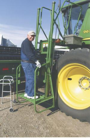 Powerstep Lifts Farmer Into Combine COMBINES Accessories Scott Perisho couldn’t have picked a worse time to break his leg A falling feed auger smashed his right femur and as he recuperated the soybeans on his Zearing Iowa farm got ripe and had to be harvested He needed a way to get into his combine without needing help from anyone else Fortunately Clayton Byjustrom’s “automated step” invention gave Perisho a lift both physically and mentally The Powerstep is designed to lift anyone smoothly and safely into the combine cab The bolt-on device uses electrical controls at the top and bottom of the lift to winch the rider to cab height A battery pack or the combine’s electrical system can be used to operate the unit A safety harness hand rails and 400-lb weight capacity provide rider safety The bottom step folds upward for manual entry Byjustrom a high school senior built the Powerstep at the request of his grandfather “Climbing those steps into the combine gets harder every year ” he said “Why don’t you design a way to make it easier for me to help with the harvest?” So Byjustrom built and installed the first Powerstep to surprise his grandfather His grandmother who hadn’t been in a combine cab for years was equally thankful for giving their lives a lift “Right then and there I could see the potential to help hundreds of farmers with disabilities and health problems ” says Byjustrom “We decided to begin producing the unit for commercial use ” He’s now showing it at fairs combine clinics and farm equipment dealerships The Powerstep is designed for combines of various sizes and colors Rentals are also available for farmers like Scott Perisho who just need a temporary lift “The Powerstep provides peace of mind and a safe harvest ” says Perisho Contact: FARM SHOW Followup Clayton Byjustrom 6814 106th Ave Milan Ill 61264 ph 563 349-5518; www Powerstepag com