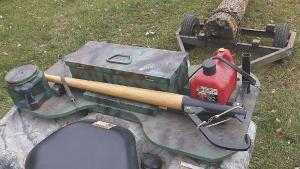 He uses his Suzuki King Quad 4-WD ATV to pull the 2-wheeled skidder, which rides on a pair of 10-in. wheels. The front end of the log is chained to a cross member located just ahead of the wheels.
