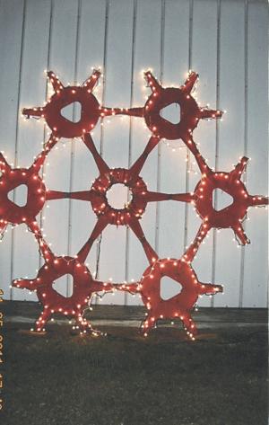 10-Ft High And Wide Metal Snowflake FARM HOME Novelty Items My husband made this 10-ft high and wide metal snowflake with multi-colored Christmas light bulbs on it using parts off a couple of old Gleaner combine reels It makes a great outside decoration during the Christmas season He simply unbolted the reels and then bolted the reel arms together into the desired shape The light bulbs are wired onto the reel arms using existing holes It sets about 200 ft from a nearby road so it gets a lot of attention Edwin and Lila Fewkes 1356 Co Rd 300 E Albion Ill 62806 ph 618 445-2753