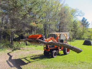 “I use it to handle everything from brush to big logs that I remove from my woods. I’m amazed at how well it works,” says Baril. “I never have to get off the tractor at all. I just scoop the branches with the forks to line them up, clamp down on them and move them wherever I want to. The shanks open up about 7 ft. high so I can pick up really big loads.”