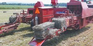 Inskeep’s double baler works efficiently because it picks up hay from large merged windrows, separates the inflow into two separate chambers, and kicks bales out two separate chutes in the back at the same time. One tractor pulls the oversize machine that Inskeep calls the “Mt. Pony Special”.