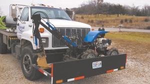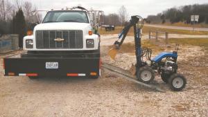 When he gets to the job site, he backs it off the carrier, puts the seat in place and drives it to the site of the septic tank. When the dirt is removed, he also uses the bucket to pick up lids, which can weigh as much as 180 lbs.
