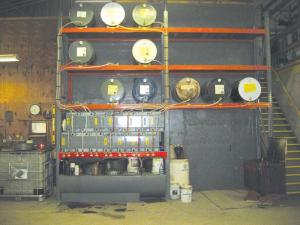“It’s convenient because we don’t have drums sitting all over our shop floor and making a mess,” says Gingerich, who is the shop manager for a small, family-owned company in the crane rental business. “We rent out about 50 cranes of different brands and models and use a lot of different oils, solvents, and antifreezes which we buy in 55-gal. drums,” he says. “I came up with the idea because I was tired of the constant mess caused by all the drums and pumps.”