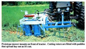 Persson's small test mower is front-mounted on a Deutz-Allis tractor, but could easily be converted to a pull-type unit with additional cutting units. Persson says at least one company has already shown interest in manufacturing the mower.