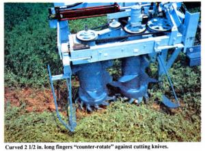 The prototype mower is fitted with a pair of cutting units, each unit consisting of two counter-rotating rotors, one above the other. The top rotor has 2 1/2-in. long curved fingers while the bottom rotor is fitted with 2-in. long cutting knives that run just below the curved fingers, turning in the opposite direction.