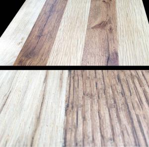 Maringer notes that oak is the best for flooring as it stands up well. However, old pine is better for flooring than new pine, which is even softer. He describes the color of pine beams as honey color brown when lightly sanded. Reclaimed oak is typically a chocolate brown color. While pine beams and boards can have a 2 to 4 week lead time, the less common oak is special order only.