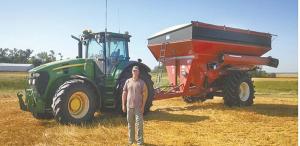 Manitoba farmer Matt Reimer uses an electronically steered tractor to pull his grain cart and in the process figures he’ll save close to $5,000 a year in harvesting costs. Reimer controls the tractor on-the-go from a laptop inside his combine. He assembled the operating system himself using funds he got as a Christmas present in 2014.