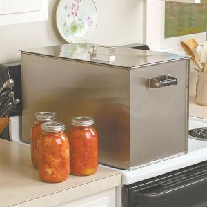 With its simple box design and no drains or valves to wear down, it simply lasts and lasts. The canner has an extra strong top edge wrapped around a 1/4-in. bar of solid stainless steel. Wooden handgrips make it easy to handle.