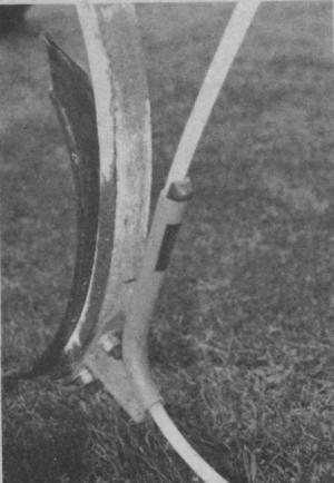 Soil immediately covers the fertilizer as it drops into the furrows created by each shank. To keep the hose from slipping, a special "widget" is tapped into the top of the bracket. It holds the hose in place and is easily removed when it comes time to let out more hose. Hoses wear from the end (there's no wear on the underside) and normally trail 12 to 18 in. behind the bracket. As the trailing end wears down, the widget is removed to let out another 12 to 18 in. of hose.
