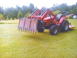 The mount makes it easy to swap the blade out on different loaders equipped with similar receiver pipes. “Just lean it up against a tree, pull the pins and drive away,” says Lusk. “Pull up with a second tractor, pin the blade and go.”