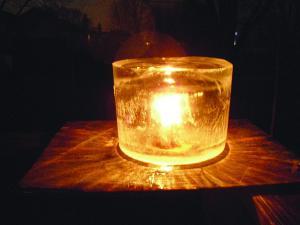 I make them by filling a plastic bucket 3/4 full of water and then letting it sit outside overnight so the water partially freezes. In the morning I place the bucket on its side, pour water over it, and slide the ice chunk out. It’s still open in the middle and at the bottom but has about a 2-in. thick layer of ice on top and along the outside. I place the chunk upright, then use a spade bit to drill a 1 1/2-in. dia. hole on top. I set the candle in a small piece of cardboard on the ground and then place the ice chunk over it. Then I use a barbeque grill lighter to light the candle.