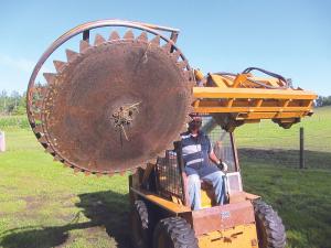 The hydraulic-powered cutter mounts on a big steel side arm made from a pair of 2 by 4-in. channel irons with 2-in. dia. pipe spacers welded on between them for strength. Mower sickle sections are bolted around the perimeter of a 36-in. dia. steel plate to clear a 42-in. wide path. The plate is shaft-driven by a hydraulic motor that’s bolted onto a square steel plate, which is welded onto a metal frame that supports everything. A round metal guard is welded onto the frame just above the sickle sections.
