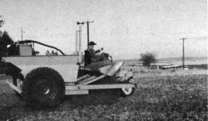 The unit has three wheels, the front one being an offset free-wheeling "crazy" wheel. The two larger back wheels are driven by a hydrostatic drive system. There is one hydraulic motor for each rear wheel. The motors are run by a conventional gasoline engine. One control lever is used for controlling forward and backward motion, and turning left and right. There is no clutch, brake, steeringwheel or gearshift. When the controlling "joystick" is moved to the left, oil feeds to the right rear wheel, moving the machine to the left, and vice versa for turning right. Since both wheels operate from one control, it can go from forward to backward instantaneously.