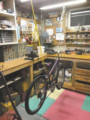 I have 5 young children and I’m trying my best to instill in them skills for building, repairing and tinkering. I figure the best way to do this is to let them practice, so I have given each of them a bench vise as a birthday or Christmas gift. I pick vises up at flea markets or garage sales and the kids all have their own workbench space. It’s a mess but they’re learning. I have 4 boys ages 3 to 8, and a girl 9. “When you want to work on a bike but don’t have a bike shop mount, suspend the bike from two ropes attached to the ceiling. Use adjustable loop knots so you can easily adjust the bike’s elevation(Ryan Van Der Bill, Sioux Falls, S. Dak.)